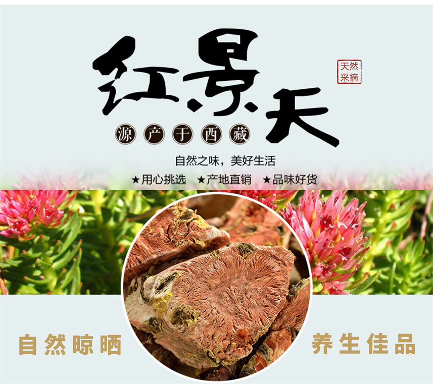 紅景天,中藥名。為景天科大花紅景天的干燥根和根莖,秋季花莖凋枯后采挖,除去粗皮,洗凈,曬干。紅景天的根莖呈圓柱形,粗短,略彎曲,少數(shù)有分枝,長5~500px,直徑2.9~112.5px。表面棕色或褐色,粗糙有褶皺,剝開外表皮有一層膜質(zhì)黃色表皮且粉紅色花紋,宿存部分老花莖,花莖基部被三角形或卵形膜質(zhì)鱗片,節(jié)間不規(guī)則,斷面粉紅色至紫紅色,有一環(huán)紋,質(zhì)輕,疏松。主根呈圓柱形,粗短,長約500px,上部直徑約37.5px,側(cè)根長10~750p..